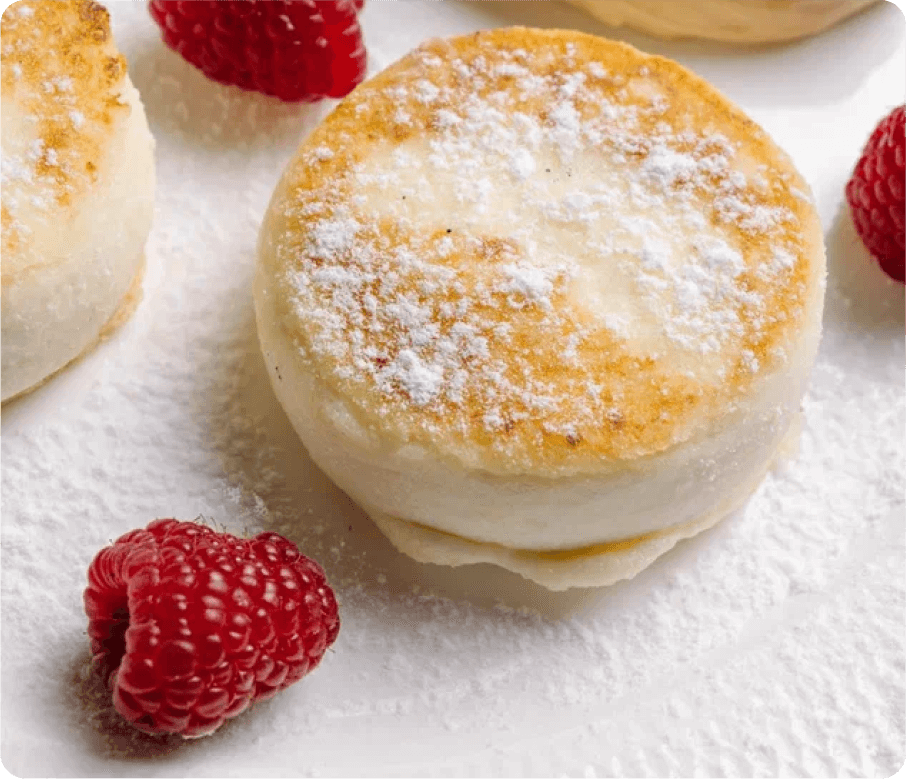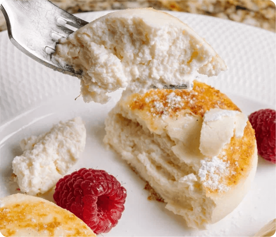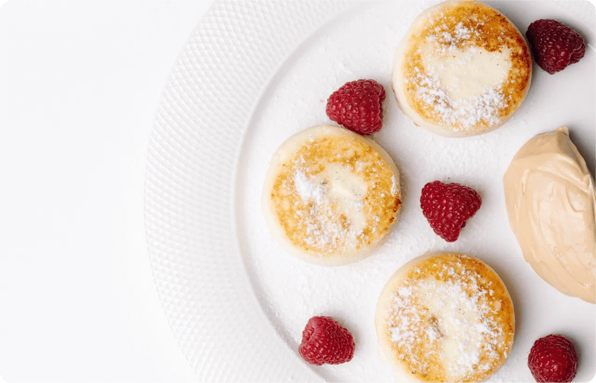 5. Оформляем: выкладываем готовые сырники, рядом кладем ложку соуса, посыпаем ягодами и сахарной пудрой