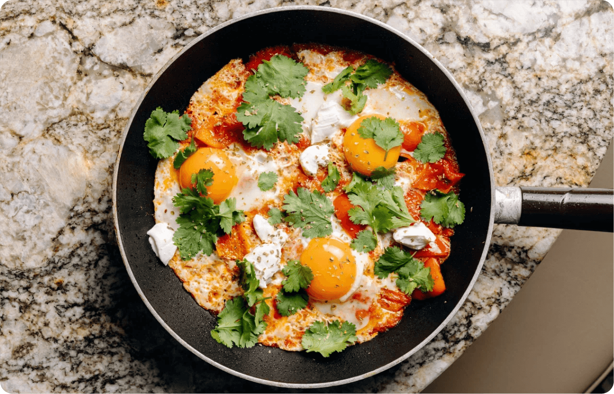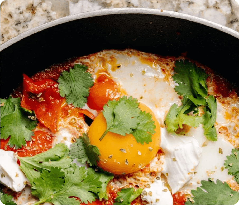 4. Готовую шакшуку снимаем с плиты, можно переложить на тарелку, я люблю шакшуку в сковородке. Раскладываем творожный сыр по всей шакшуке, затем листья кинзы, посыпаем немного орегано, поливаем оливковым маслом